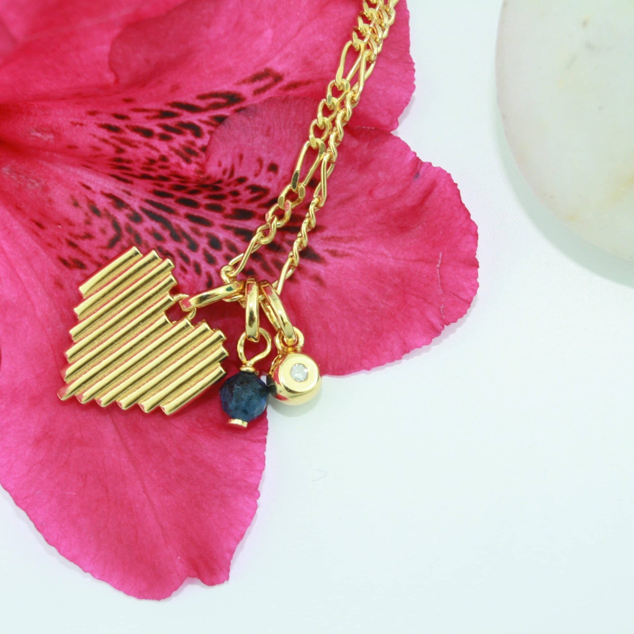 Dette safir vedhæng til halskæde repræsenterer september måned. Med sin stærke røde farve symboliserer safiren harmoni, venskab og loyalitet. Kombiner evt. guld vedhænget med Boy, Girl, Cross eller Heart Rock vedhængene for at skabe dit helt eget personlige smykke.