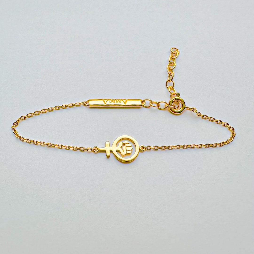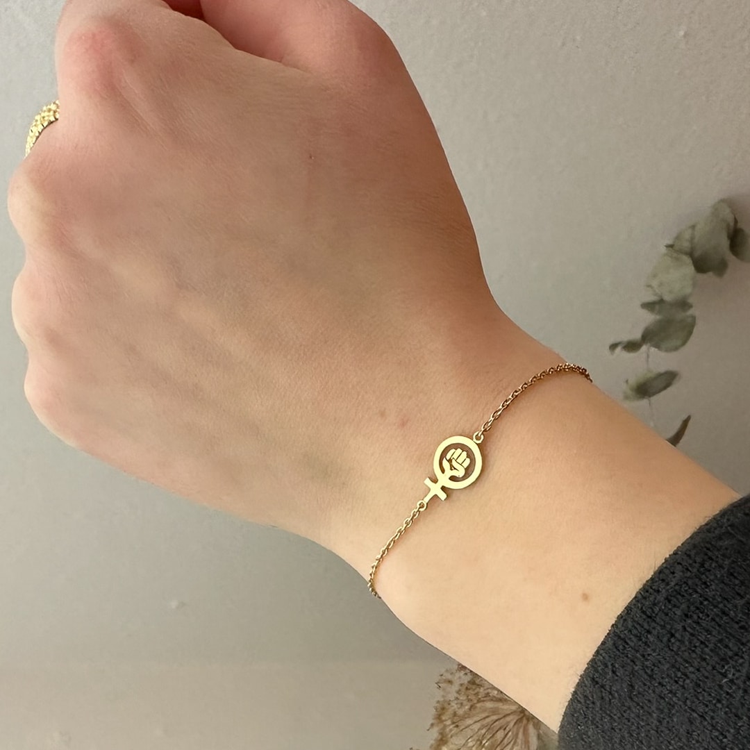- Kvindetegn med knyttet løftet hånd som armbånd.