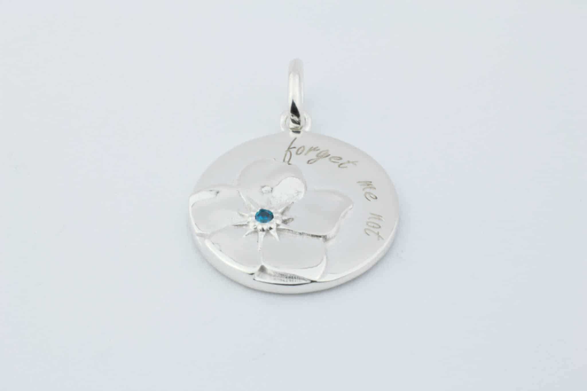 Flot halskæde med vedhæng med motiv af Forglemmigej blomsten i sølv. Vedhængets glatte og skinnende overflade giver et stilrent og smukt udtryk. Forget me not er indgraveret.